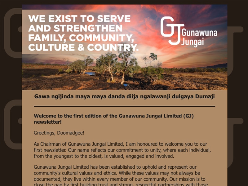 Gunawuna Jungai was endorsed by the Doomadgee Aboriginal Shire Council and Mayor Jason Ned as a community-controlled organisation for the people of Doomadgee. In 2022, Gunawuna Jungai was established with the enduring support of third-party organisations King & Wood Mallesons and Act for Kids together with a cash injection from Auto & General.